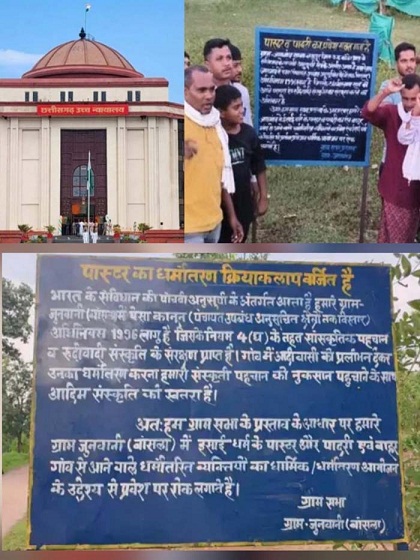 दरअसल, कांकेर के रहने वाले दिग्बल टांडी और जगदलपुर के रहने वाले नरेंद्र भवानी ने हाईकोर्ट में अलग-अलग जनहित याचिकाएं लगाई थी। जिसमें बताया गया कि जिले के कुदाल, परवी, बांसला, घोटा, घोटिया, मुसुरपुट्टा और सुलंगी जैसे गांवों में ग्राम पंचायतों ने पेसा एक्ट का हवाला देकर होर्डिंग्स लगाए हैं। होर्डिंग्स में लिखा है कि गांव पांचवीं अनुसूची क्षेत्र में आता है और ग्राम सभा संस्कृति की रक्षा के लिए पादरियों और धर्मांतरितों को धार्मिक कार्यक्रम या धर्मांतरण के लिए प्रवेश की अनुमति नहीं है। याचिकाकर्ताओं ने कहा कि ग्राम पंचायतों ने पेसा एक्ट का हवाला देकर होर्डिंग्स लगाए हैं, जो संविधान के अनुच्छेद 19 (1) (डी) और 25 का उल्लंघन हैं। उनका यह भी आरोप है कि राज्य सरकार के 14 अगस्त 2025 के सर्कुलर से प्रेरित होकर ये होर्डिंग्स लगाए गए हैं।