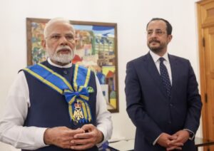 नई दिल्ली। भारत के प्रधान मंत्री नरेंद्र मोदी को साइप्रस ने अपना सर्वोच्च नागरिक पुरस्कार से नवाजा है। 23 वर्षों में साइप्रस की यात्रा करने वाले पहले भारतीय प्रधानमंत्री नरेंद्र मोदी को साइप्रस के राष्ट्रपति, निकोस क्रिस्टोडोलाइड्स ने ग्रैंड क्रॉस ऑफ द ऑर्डर ऑफ मकारियोस III से सम्मानित किया है। पीएम मोदी रविवार को इस भूमध्यसागरीय द्वीप देश पहुंचे हैं जहां राष्ट्रपति निकोस ने एयरपोर्ट पर उनका स्वागत किया।
