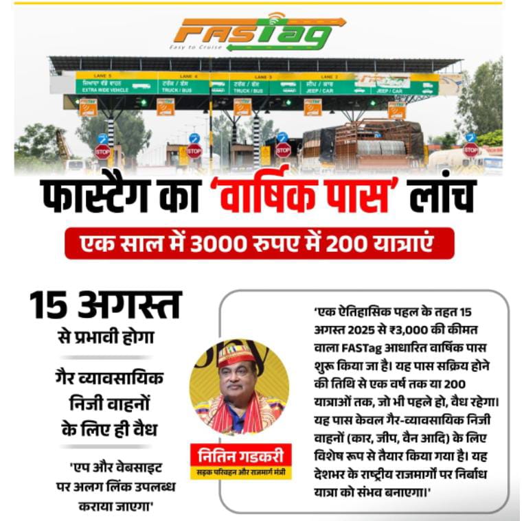 KWNS – देशभर में हाईवे पर सफर करना अब और भी आसान और सस्ता हो जाएगा। केंद्रीय सड़क परिवहन मंत्री नितिन गडकरी ने लंबे समय से चल रही अटकलों पर विराम लगाते हुए FASTag Annual Pass लॉन्च करने की घोषणा कर दी है। इस स्कीम के तहत सिर्फ ₹3000 में आप सालभर में 200 बार हाईवे पर बिना किसी अतिरिक्त टोल चार्ज के सफर कर सकेंगे।