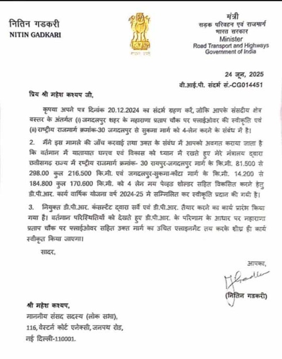 खबर वर्ल्ड न्यूज-राकेश पांडेय-जगदलपुर। बस्तर सांसद महेश कश्यप ने 20 दिसंबर 2024 को केंद्रीय परिवहन मंत्री नितिन गडकरी को पत्र लिखकर जगदलपुर शहर के महाराणा प्रताप चौक पर फ्लाई ओवर एवं राष्ट्रीय राजमार्ग क्रमांक-30 जगदलपुर से सुकमा मार्ग को 4-लेन करने की मांग की थी।