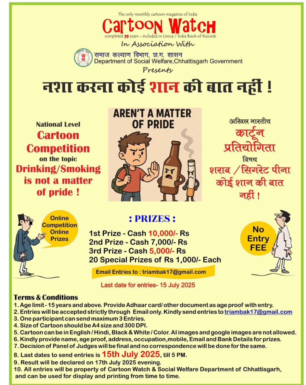प्रतियोगिता में नगद पुरस्कार रखे गये हैं. प्रथम पुरस्कार दस हजार रूपये, द्वितीय पुरस्कार सात हजार रूपये, तृतीय पुरस्कार पांच हजार रूपये और एक एक हजार रूपये के बीस विशेष पुरस्कार भी प्रदान किये जायेंगे. इस हेतु कार्टून वॉच पत्रिका के ई मेल जतपंउइां17/हउंपसण्बवउ पर प्रविष्टियां भेजी जा सकती हैं. एक प्रतियोगी अधिकतम तीन कार्टून ही भेज सकता है. इस प्रतियोगिता में एआई का इस्तेमाल और गूगल इमेज का इस्तेमाल प्रतिबंधित रहेगा. कार्टून तीन सौ डीपीआई में हों और उसके साथ नाम पता व्यवसाय और उम्र का प्रमाण लिखना आवश्यक होगा. चयनित कार्टून पर कार्टून वॉच का नशा विरोधी अंक भी प्रकाशित किया जायेगा.