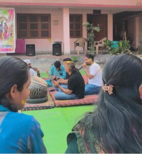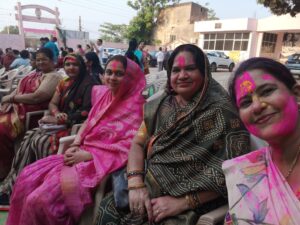 इसके बाद महिलाओं ने पारंपरिक परिधानों में समूह बनाकर होली के लोकगीत गाए और एक-दूसरे को रंग लगाकर उत्सव की खुशियाँ साझा कीं। दूसरी ओर पुरुष वर्ग भी बड़ी संख्या में उपस्थित रहा और नगाड़ों की गूंजती थाप पर फाग गीत गाते हुए जमकर नृत्य किया। युवाओं ने ढोल-नगाड़ों की धुन पर ऊर्जावान प्रस्तुतियाँ देकर समारोह में जोश भर दिया और पूरे परिसर को उत्सवमय बना दिया।