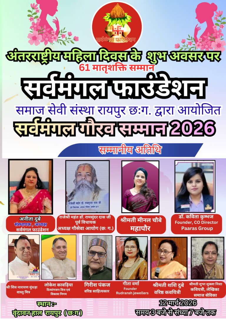 KWNS -प्रिया पाठक, रायपुर। अंतर्राष्ट्रीय महिला दिवस के उपलक्ष्य में, सर्वमंगल फाउंडेशन द्वारा 12 मार्च को एक भव्य सम्मान समारोह का आयोजन किया जाएगा। इस कार्यक्रम में समाज के विभिन्न क्षेत्रों में उत्कृष्ट योगदान देने वाली महिलाओं को सम्मानित किया जाएगा।