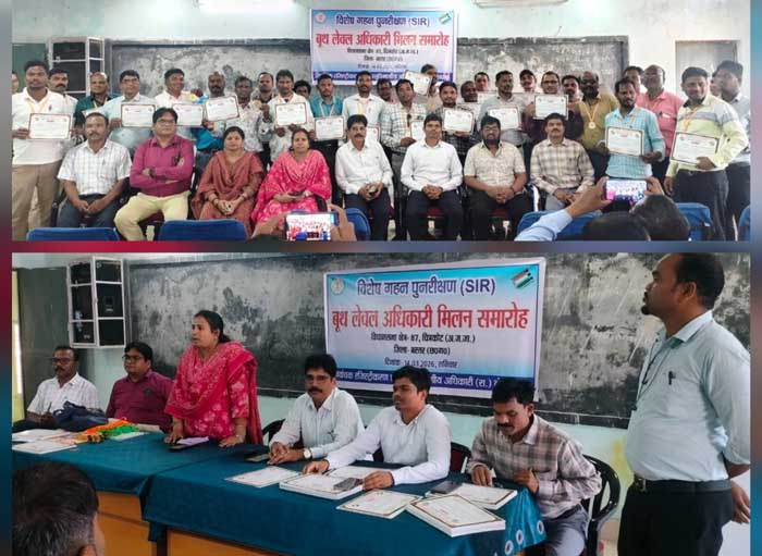 खबर वर्ल्ड न्यूज-राकेश पांडेय-जगदलपुर। विधानसभा क्षेत्र 87 चित्रकोट के अंतर्गत विशेष संक्षिप्त पुनरीक्षण (SIR) के कार्य का सफलतापूर्वक संपादन किए जाने पर सभी बीएलओ और सुपरवाइजरों को जिला निर्वाचन अधिकारी आकाश छिकारा के मार्गदर्शन में प्रशस्ति प्रमाण पत्र एवं मेडल देकर अनुविभागीय दंडाधिकारी तोकापाल शंकर लाल सिन्हा द्वारा आज सम्मानित किया गया। इस अवसर पर विधानसभा क्षेत्र 87 चित्रकोट के अंतर्गत लोहंडीगुड़ा, दरभा, बास्तानार और तोकापाल के सभी एईआरओ (AERO) एवं ईआरओ (ERO) चित्रकोट भी उपस्थित रहे। कार्यक्रम में निर्वाचन कार्यों में उत्कृष्ट योगदान देने वाले अधिकारियों और कर्मचारियों की सराहना की गई।