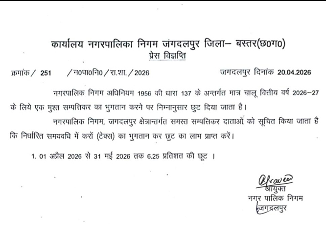 खबर वर्ल्ड न्यूज-राकेश पांडेय-जगदलपुर। नगर पालिक निगम जगदलपुर ने शहरवासियों को बड़ी राहत देते हुए चालू वित्तीय वर्ष 2026-27 के लिए संपत्तिकर पर विशेष छूट की घोषणा की है। निगम प्रशासन ने एकमुश्त भुगतान करने वाले करदाताओं को 6.25 प्रतिशत की छूट देने का निर्णय लिया है। यह सुविधा 1 अप्रैल 2026से 31 मई 2026 तक लागू रहेगी।