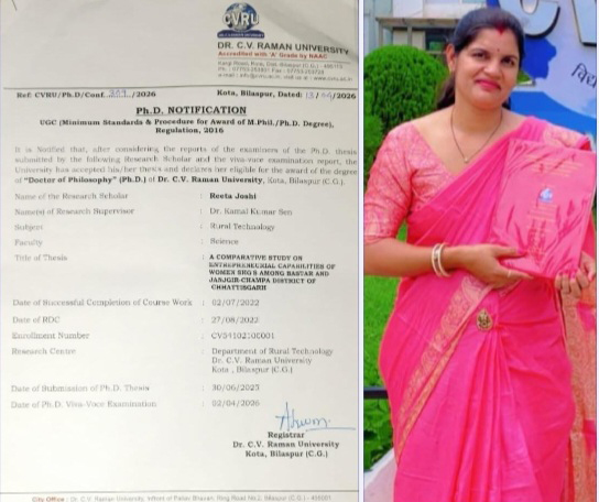 - बस्तर की बेटियों का सशक्तिकरण: रीता जोशी को महिला स्व-सहायता समूहों पर शोध के लिए मिली पीएचडी की उपाधि